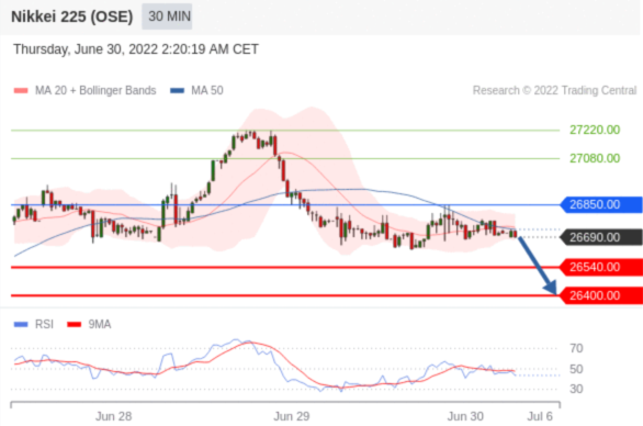 交易策略: 在 26850.00 之下,看跌,目标价位为 26540.00 ,然后为 26400.00 。