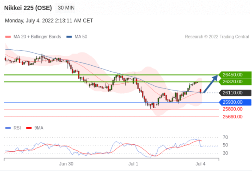 日经225股指期货 (OSE) (U2) 当日内交易策略: 在 25930.00 之上 目标价位为 26320.00(20220704)