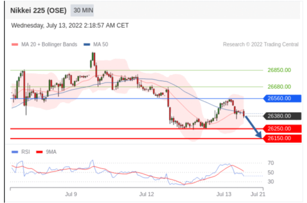 日经225股指期货 (OSE) (U2) 当日内交易策略: 在 26560.00 之下 目标价位为 26250.00(20220713)