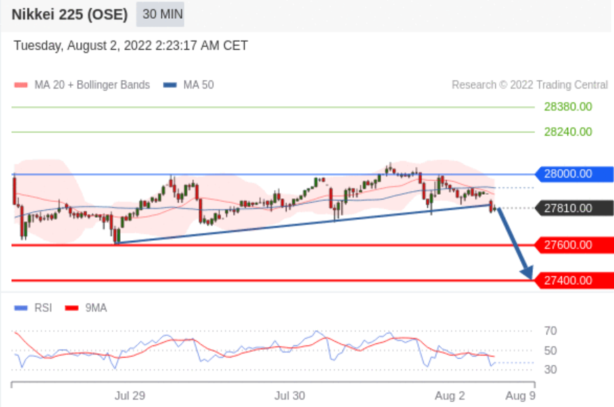 交易策略: 在 28000.00 之下,看跌,目标价位为 27600.00 ,然后为 27400.00 。