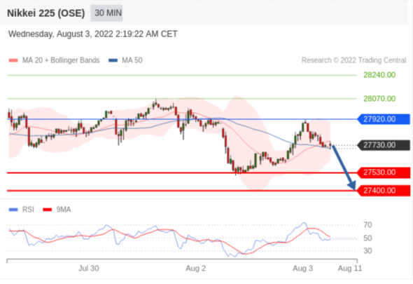 交易策略: 在 27920.00 之下,看跌,目标价位为 27530.00 ,然后为 27400.00 。