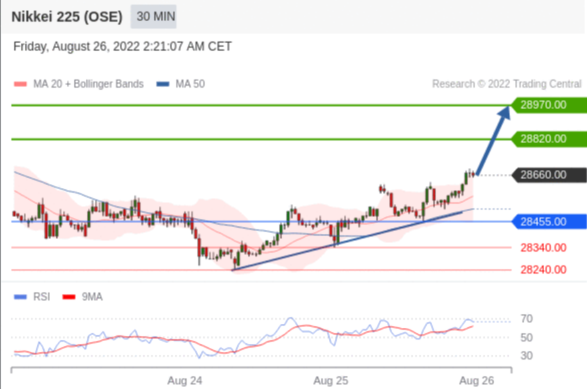 日经225股指期货 (OSE) (U2) 当日内交易策略: 在 28455.00 之上 目标价位为 28820.00(20220826)