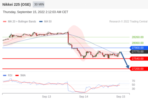 在 27900.00 之下,看跌,目标价位为 27540.00 ,然后为 27200.00 。