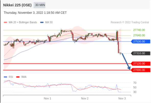 在 27530.00 之下,看跌,目标价位为 27120.00 ,然后为 27000.00 。