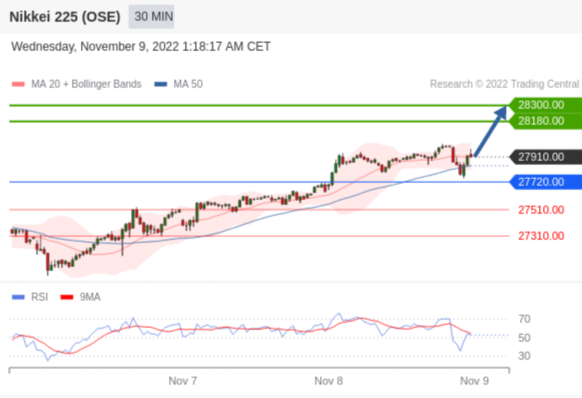 日经225股指期货 (OSE) (Z2) 当日内交易策略: 在 27720.00 之上 目标价位为 28180.00 (20221109)