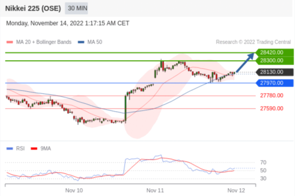 日经225股指期货 (OSE) (Z2) 当日内交易策略: 在 27970.00 之上 目标价位为 28300.00(20221114)