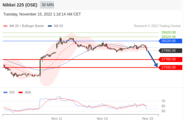 交易策略: 在 28220.00 之下,看跌,目标价位为 27780.00 ,然后为 27590.00 。