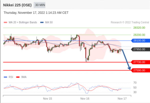 日经225股指期货 (OSE) (Z2) 当日内交易策略: 在 28100.00 之下 目标价位为 27730.00(20221117)