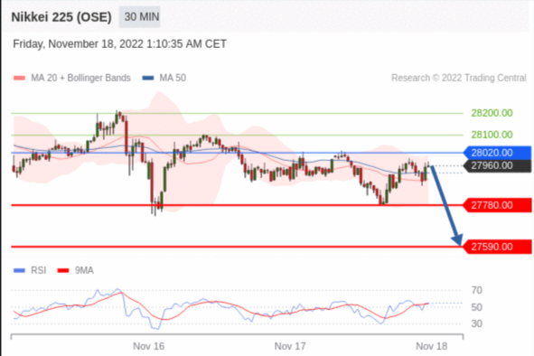 交易策略: 在 28020.00 之下,看跌,目标价位为 27780.00 ,然后为 27590.00 。