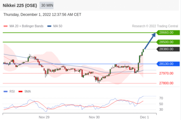 日经225股指期货 (OSE) (Z2) 当日内交易策略: 在 28130.00 之上 目标价位为 28500.00(20221201)