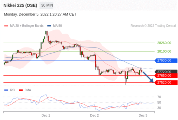 交易策略: 在 27930.00 之下,看跌,目标价位为 27650.00 ,然后为 27520.00 。