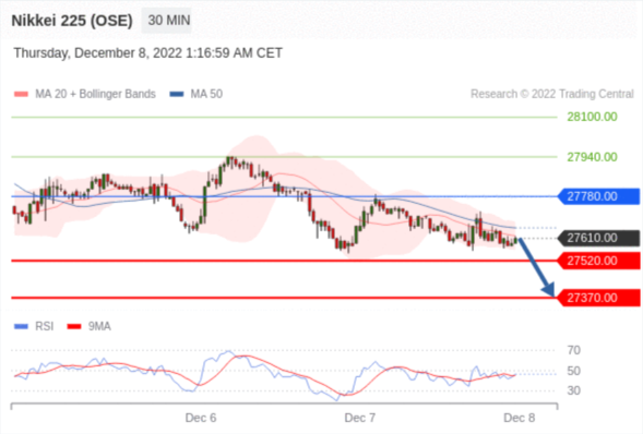 日经225股指期货 (OSE) (Z2) 当日内交易策略: 在 27780.00 之下 目标价位为 27520.0(20221208)