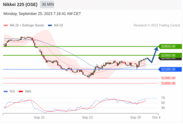 日经225股指期货 (OSE) 当日内交易策略: 在 32180.00 之上 目标价位为 32560.00 (20230925)
