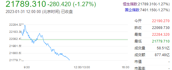 港股上午盘三大指数高开小幅冲高后持续回落均转跌,恒生科技指数跌1.59%,恒指跌1.28%,国指跌1.27%,三者均呈高开低走行情,且连续2日自高位回调。