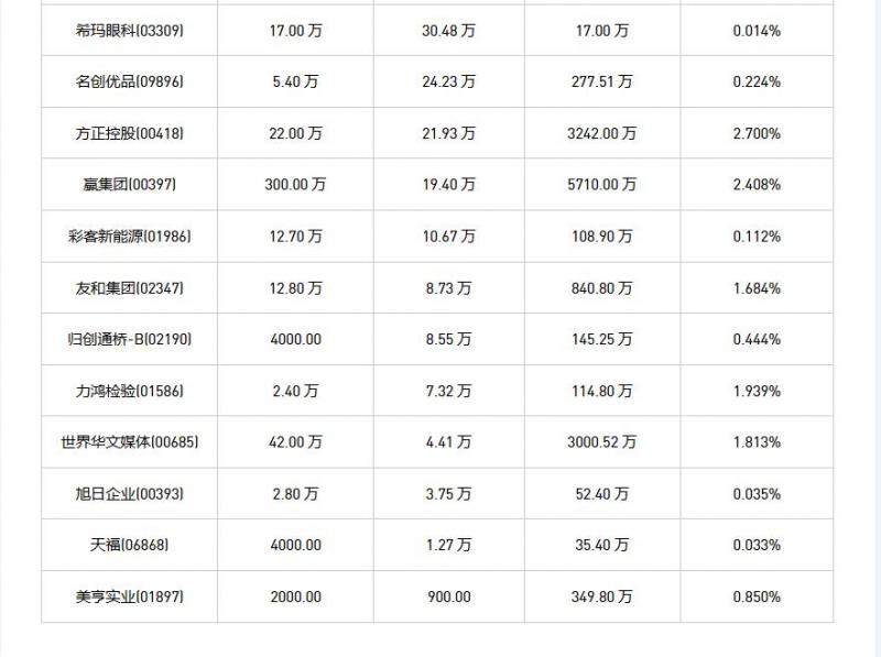 方正控股(00418)、现代牙科(03600)、力鸿检验(01586)、信利国际(00732)、中电光谷(00798)、蒙牛乳业(02319)、中集集团(02039)、VITASOY INT'L(00345)、首佳科技(00103)、世界华文媒体(00685)、嬴集团(00397)、天福(06868)、友和集团(02347)、IGG(00799)、旭日企业(00393)、希玛眼科(03309)、归创通桥-B(02190)、卡罗特(N24025)、名创优品(09896)、康臣药业(01681)、中国东方航空股份(00670)、彩客新能源(01986)、美亨实业(01897)、名创优品(09896)、贝壳-W(02423)、百胜中国(09987)、百胜中国(09987)于2025年7月18日进行了回购。其中,回购金额最大的为VITASOY INT'L(00345),回购数量104.40 万,回购金额966.71 万元。
