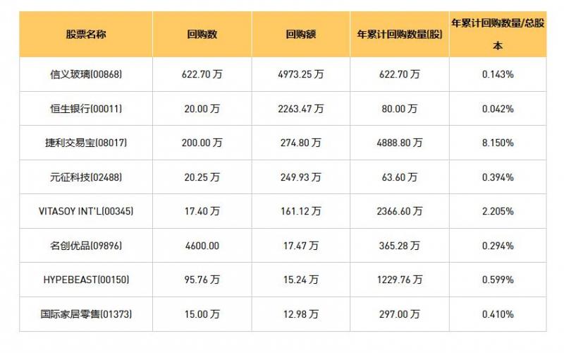 08月07日港股回购概况: 元征科技(02488)、VITAOYINT'L(00345)、捷利交易宝(08017)、国际家居零售(01373)、名创优品(09896)、恒生银行(00011)、信义玻璃(00868)、HYBAT(00150)于2025年8月6日进行了回购。其中,回购金额最大的为信义玻璃(00868),回购数量622.70万,回购金额4973.25万元。