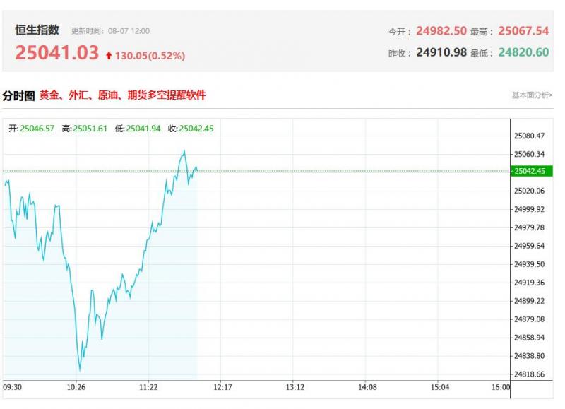 上午盘面: 港股上午盘三大指数探底回升,临近午盘持续拉涨,恒生指数午间收涨0.52%重回25000点上方,国企指数、恒生科技指数分别上涨0.36%及0.54%。盘面上,大型科技股多数呈现上涨行情,阿里巴巴涨2.4%,京东、百度涨近2%,美团涨1%,大和预计Q2智能手机出货量或低于预期,小米逆势跌超4%;芯片制造商未受美
