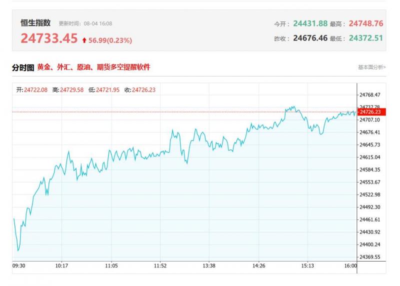 港股收盘行情: 香港恒生指数8月4日(周一)收盘上涨225.64点,涨幅0.92%,报24733.45点; 香港恒生科技指数8月4日(周一)收盘上涨83.85点,涨幅1.55%,报5481.25点; 国企指数8月4日(周一)收盘上涨89.06点,涨幅1.01%,报8893.48点; 红筹指数8月4日(周一)收盘上涨5.34点,涨