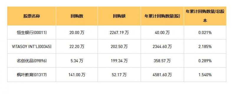 08月05日港股回购概况: VITAOYINT'L(00345)、名创优品(09896)、恒生银行(00011)、枫叶教育(01317)于2025年8月4日进行了回购。其中,回购金额最大的为恒生银行(00011),回购数量20.00万,回购金额2267.19万元。 (亚汇网编辑:书瑶)