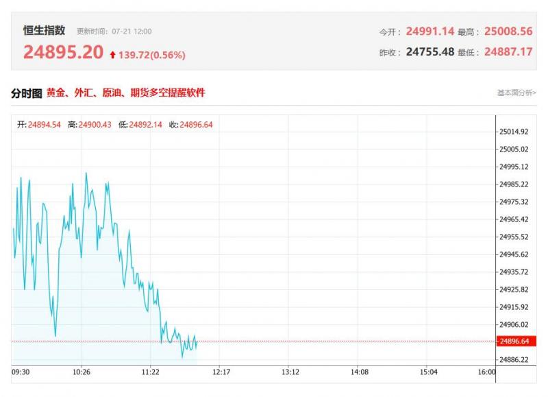 上午盘面: 港股上午盘三大指数集体上涨,盘中均刷新4月以来新高价。截止午盘,恒生指数涨0.28%一度站上25000点,国企指数、恒生科技指数分别上涨0.14%及0.32%。盘面上,大型科技股普遍呈现上涨行情,其中,美团涨约3%,京东涨超2%,阿里巴巴涨1.8%,百度、小米飘红;雅鲁藏布江水电工程开工,涉1.2万亿投资,
