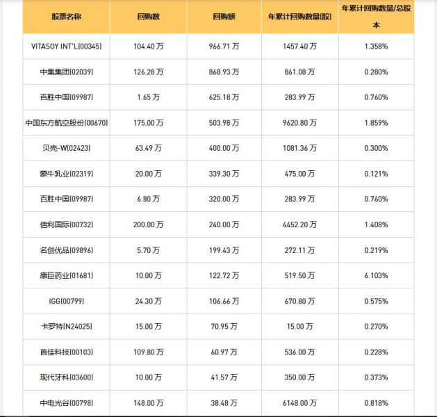 07月21日港股回购概况: 方正控股(00418)、现代牙科(03600)、力鸿检验(01586)、信利国际(00732)、中电光谷(00798)、蒙牛乳业(02319)、中集集团(02039)、VITAOYINT'L(00345)、首佳科技(00103)、世界华文媒体(00685)、嬴集团(00397)、天福(06868)、友和集团(02347)、IGG(00799)、旭日
