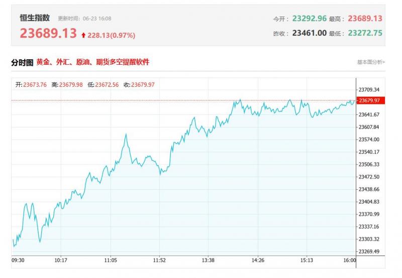港股收盘行情: 香港恒生指数6月23日(周一)收盘上涨158.65点,涨幅0.67%,报23689.13点; 香港恒生科技指数6月23日(周一)收盘上涨53.87点,涨幅1.05%,报5187.01点; 国企指数6月23日(周一)收盘上涨70.29点,涨幅0.82%,报8597.36点; 红筹指数6月23日(周一)收盘上涨38.21点,涨幅0
