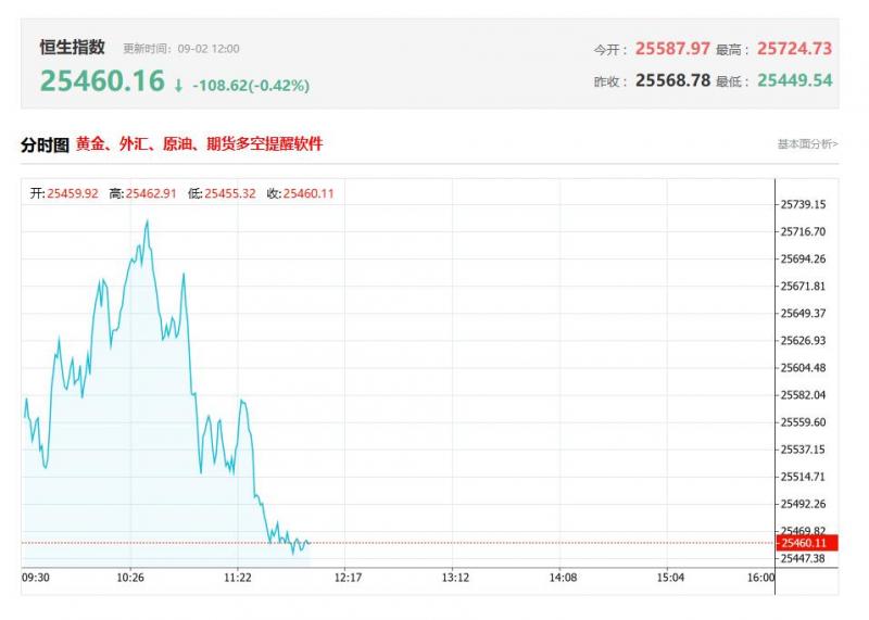 港股收盘行情: 香港恒生指数9月2日(周二)收盘下跌120.87点,跌幅0.47%,报25496.55点; 香港恒生科技指数9月2日(周二)收盘下跌70.5点,跌幅1.22%,报5728.46点; 国企指数9月2日(周二)收盘下跌13.75点,跌幅0.15%,报9108.12点; 红筹指数9月2日(周二)收盘下跌44.72点,跌
