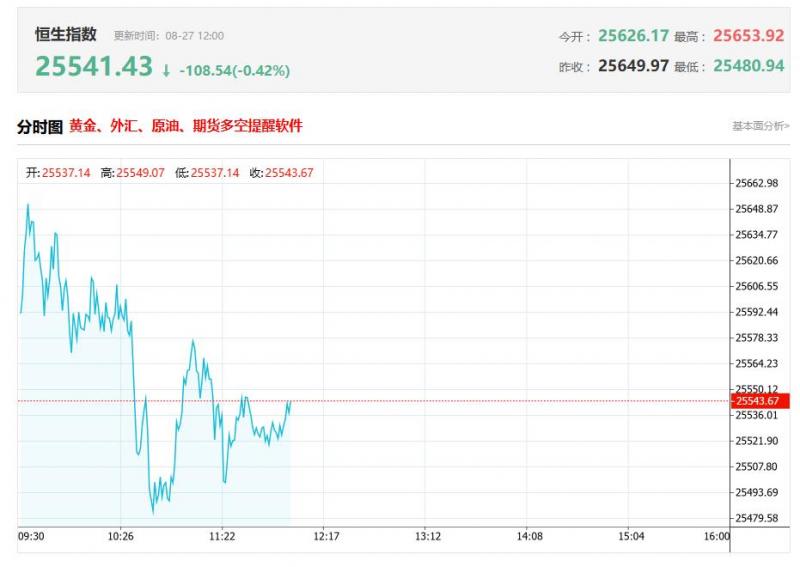 上午盘面: 港股上午盘三大指数高开略有回落但均维持上涨,截止午盘,恒生指数涨0.06%,国企指数涨0.14%,恒生科技指数涨0.57%盘中一度涨至1.2%,再度刷新阶段新高。盘面上,大型科技股涨跌各异,阿里巴巴、小米涨超1%,美团、京东跌超1%;深入实施人工智能+行动意见印发,半导体芯片股、AI软件类股表现强势,