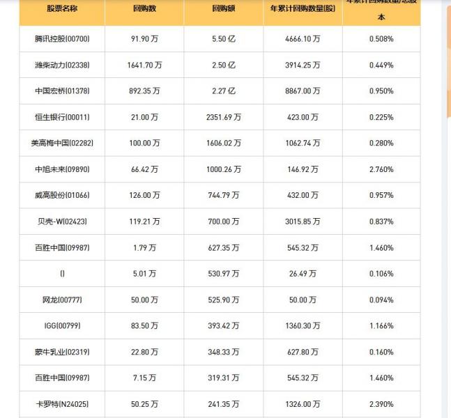 08月27日港股回购概况: HYBAT(00150)、津上机床中国(01651)、归创通桥-B(02190)、清科创业(01945)、天福(06868)、旭日企业(00393)、北森控股(09669)、四洲集团(00374)、美高梅中国(02282)、腾讯控股(00700)、恒生银行(00011)、骏杰集团控股(08188)、彩客新能源(01986)、乐华娱乐(023