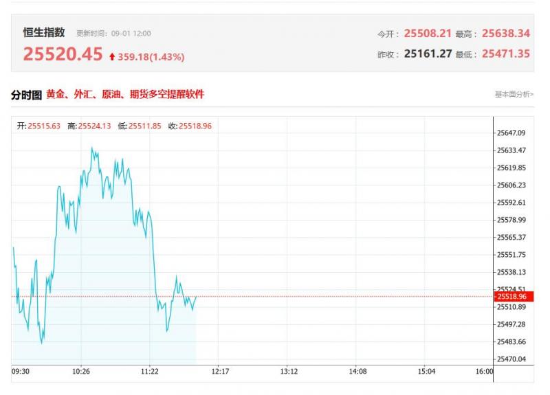 上午盘面: 港股上午盘三大指数集体上涨,盘中均涨超1.1%以上,继昨日南下资金净卖出后再度呈现净买入趋势。截止午间收盘,恒生指数涨0.63%重上25000点,国企指数、恒生科技指数分别上涨0.68%及0.56%。盘面上,大型科技股普遍呈现上涨行情,其中,百度涨超3%,京东涨2.6%,阿里巴巴、腾讯、美团、网易皆上涨,小
