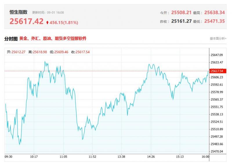 港股收盘行情: 香港恒生指数9月1日(周一)收盘上涨539.8点,涨幅2.15%,报25617.42点; 香港恒生科技指数9月1日(周一)收盘上涨124.65点,涨幅2.2%,报5798.96点; 国企指数9月1日(周一)收盘上涨174.08点,涨幅1.95%,报9121.87点; 红筹指数9月1日(周一)收盘上涨20.34点,