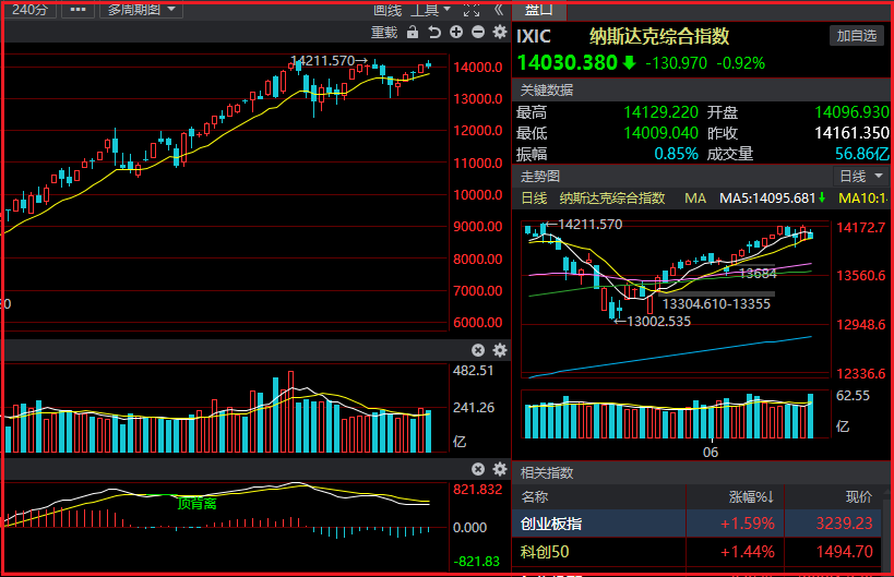技术层面纳斯达克指数箱体上沿测试,短期有突破的可能性,若站稳14200,那么有望加速上涨,下方多空分水岭13700不破维持多头结构不变,不排除站上14200之后形成加速的可能性。
