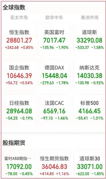 美东时间周五,美股全线下跌,道指连续五个交易日下滑,创2020年10月以来的最大周跌幅。截止收盘,道指跌533.37点,跌幅1.58%,报33290.08点;纳指跌130.97点,跌幅0.92%,报14030.38点;标普500指数跌55.41点,跌幅1.31%,报4166.45点。盘面上,银行股、能源股走低,大型科技股多数收跌,中概教育股反弹。