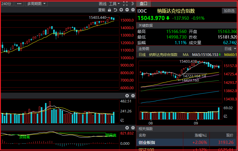 技术层面纳斯达克指数新高之后回踩,目前依然维持上涨通道,短期多空分水岭15000不破,则存在继续上行的可能性,上方压力关注前高15400附近,在没有突破之前按照区间震荡对待。