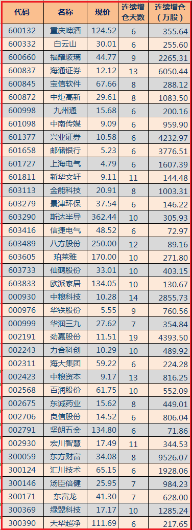 北向资金连续增仓方面,劲嘉股份(002191)连增19天、中粮科技(000930)连增14天、海通证券(600837)连增13天,占据前三位。其他连增6日以上个股如下(已剔除当日除权股票):