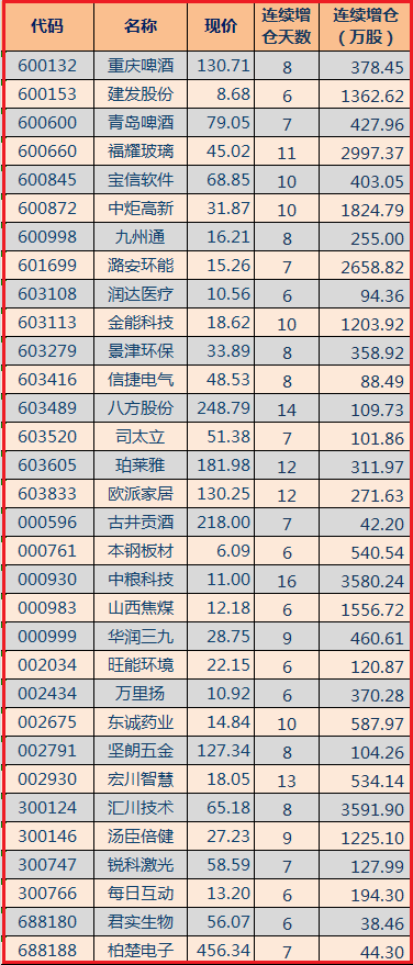 4.沪深两市成交金额连续第46个交易日突破万亿,盘面上,涨停个股明显缩减到六十多家,而且多少涨停个股还是属于那种冷门板块的品种,唯一好的是北上资金出现了净流入,权当是一个利好吧。北向资金连续增仓方面,中粮科技(000930)连增16天、八方股份(603489)连增14天、宏川智慧(002930)连增13天,占据前三位。其他连增6日以上个股如下(已剔除当日除权股票):