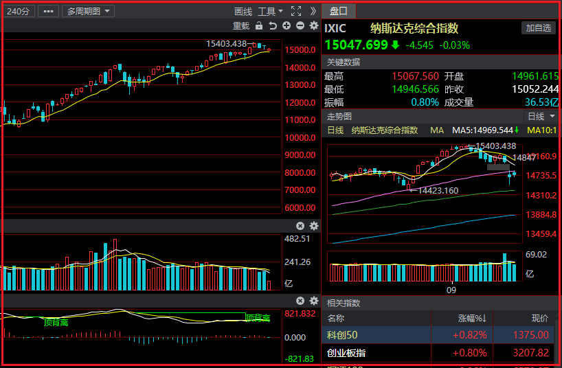 技术层面纳斯达克指数日线级别重新站上14800,短期重返多头区间,但是要注意,前高附近若无法突破则回归区间震荡,因此追涨注意风险,等待突破为主。
