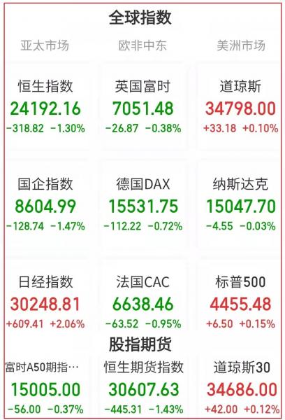 美东时间周五,美国三大指数涨跌不一,截止收盘,道指涨33.18点,报34798.00点,涨幅0.10%;纳指跌4.54点,报15047.70点,跌幅0.03%;标普500指数涨6.50点,报4455.48点,涨幅0.15%。本周,道指累涨0.62%,纳指累涨0.02%,标普500指数累涨0.51%。