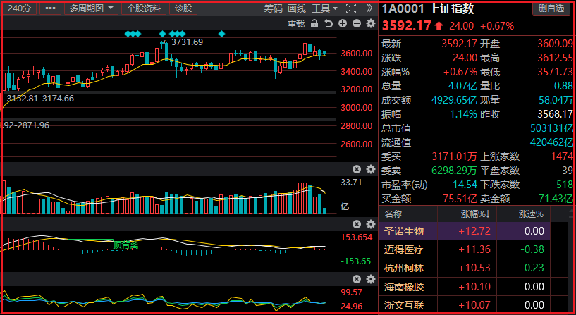 3.周五市场呈现高开回落、然后又企稳反弹的走势,投资者可以看到,早盘沪指高开40点于3609点,创业板高开14点于3259点,早盘高开以后市场最高3612点以后就遇阻回落,午后回踩最低3571点,同步回补缺口、又出现分时线低点以后支撑反弹,盘尾还算不错!
