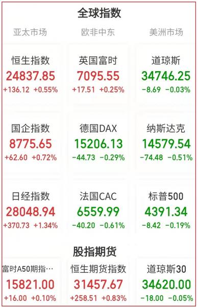 在欧洲各国股市中,英国富时100指数涨0.97%,报收于7095.55点;德国DAX 30指数收涨0.33%,报收于15206.13点;法国CAC 40指数收涨0.65%,报收于6559.99点。与此同时,意大利富时MIB指数收涨1.71%,报收于26044.00点。