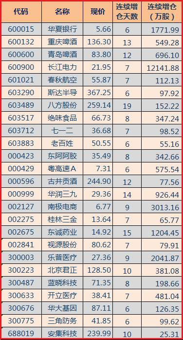 北向资金连续增仓方面,八方股份(603489)连增19天、东诚药业(002675)连增15天、华润三九(000999)连增14天,占据前三位。其他连增6日以上个股如下(已剔除当日除权股票):