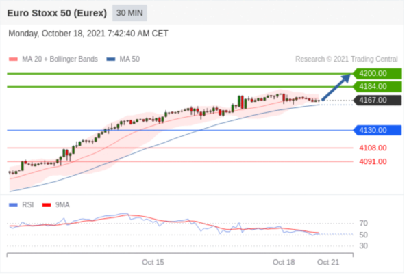 Euro Stoxx 50 (Eurex) (Z1) 当日内交易策略: 在 4130.00 之上 目标价位为 4184.00(20211018)