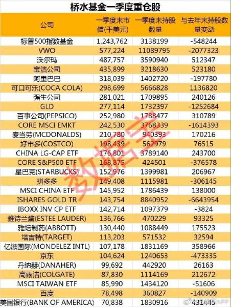 根据桥水C13F一季度持仓数据,共增持204个标的,减持123个标的,新进127个标的,清仓197个标的。从整体操作来看,桥水一季度主要加仓方向为消费股,如前五大加仓股为日用消费品领头羊宝洁公司、家居改善零售商劳氏公司、可口可乐公司、强生公司和沃尔玛,对标普500TF、新兴市场指数和黄金TF等基金做出了较大减持。截至一