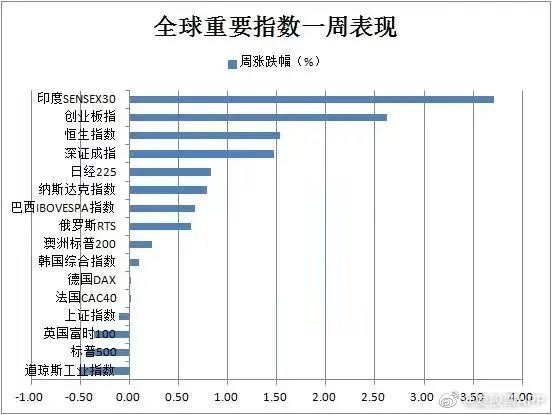 本周,全球重要股票指数涨多跌少,涨幅居前的有印度NX30指数上涨3.71%,创业板指数涨1.62%,恒生指数涨1.54%,道琼斯指数和法国CAC40指数跌幅靠后,分别下跌0.87%和0.65%。 期货市场本周波动较大,中国期货市场的动力煤指数、热卷指数、螺纹指数、焦煤指数、铁矿指数、焦炭指数和玻璃指数均本周下跌幅度均超10%。国际