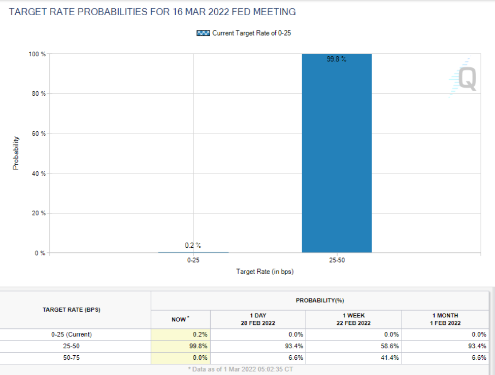 这场战争会阻止美联储的加息计划吗?这是市场面临的问题,市场正在等待美联储主席杰罗姆·鲍威尔的关键证词。这位全球最有权势的央行行长一直在考虑,是将借贷成本按标准上调25个基点,还是加倍上调50个基点。俄罗斯入侵乌克兰引发了新的质疑。 债券市场已大幅改变了对美联储的预期——在就业市场火热的情况下,美联储