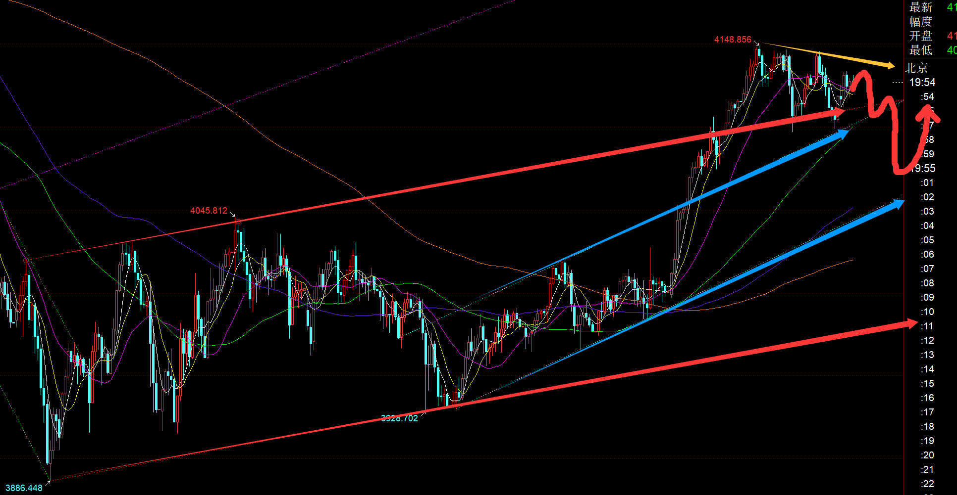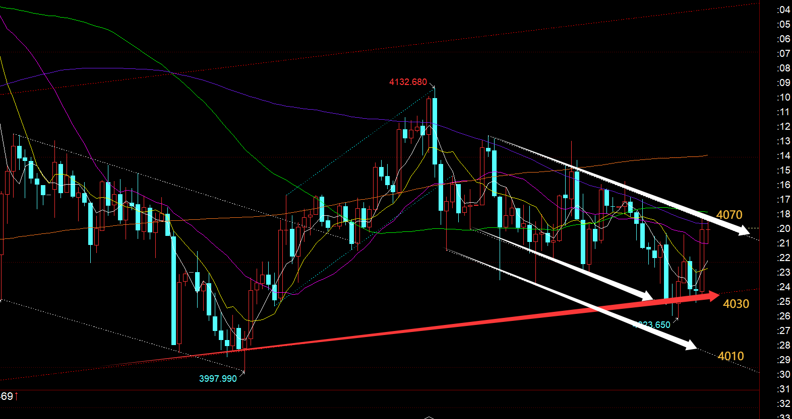 郑氏点银:黄金早间4150上成功打压一波,今晚4097上看涨 回顾昨日行情走势及出现的技术点: 第一,黄金方面:昨日早间先依托前一日高低点的618分割位置4053,且也靠近收盘前4055两次支撑反弹的位置进行震荡尝试看涨,但价格并未支撑,直接跌至4040,而此位置属于近期一个月以来的底
