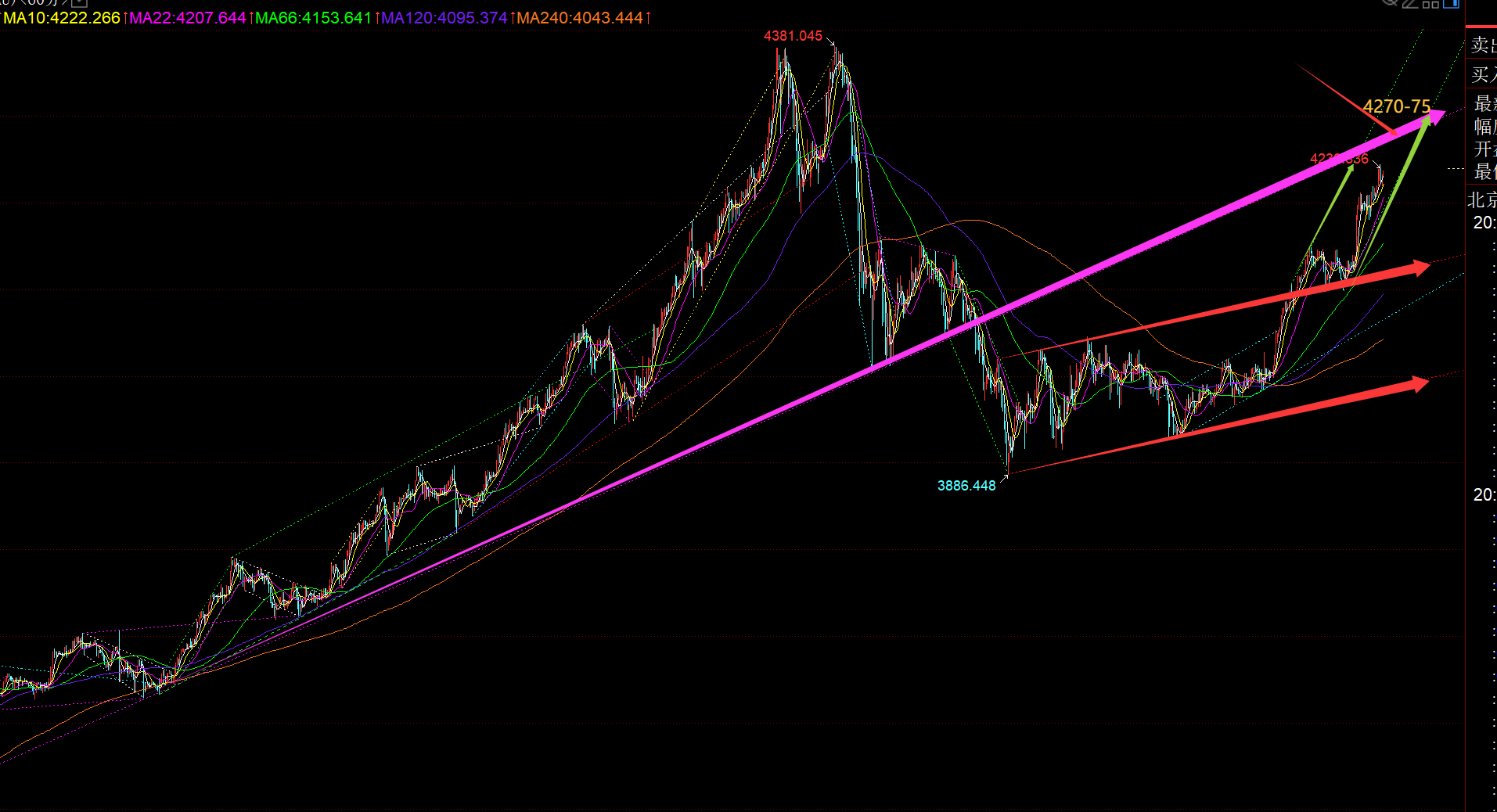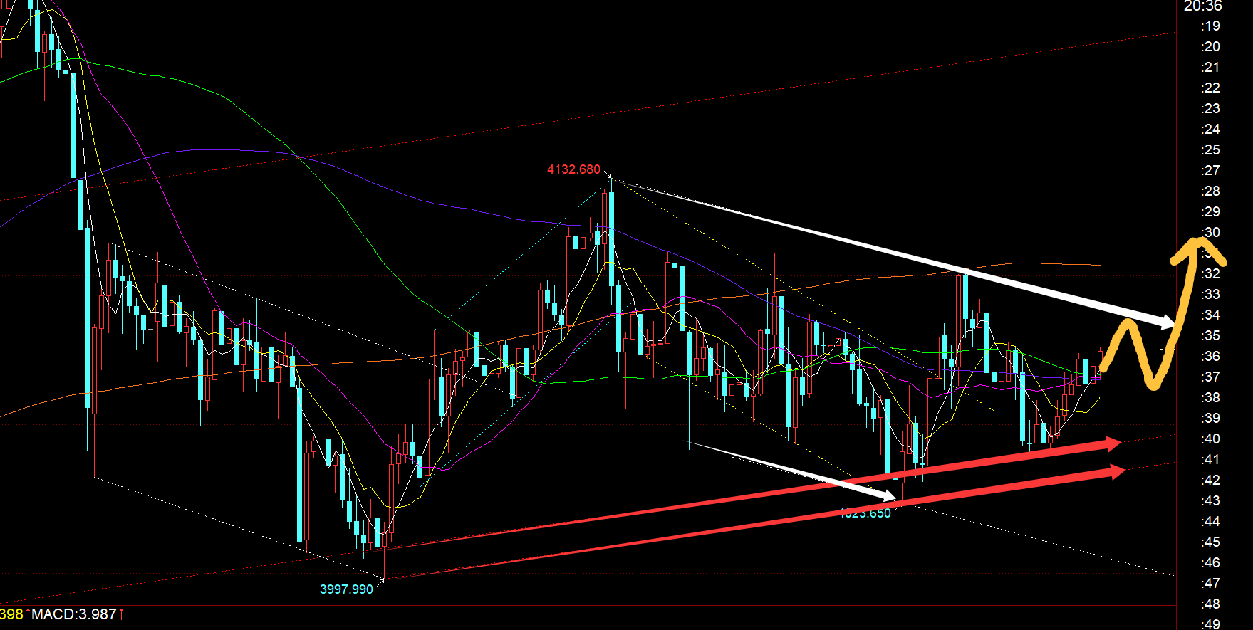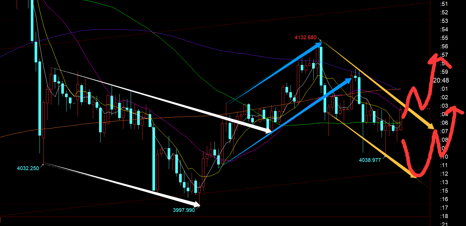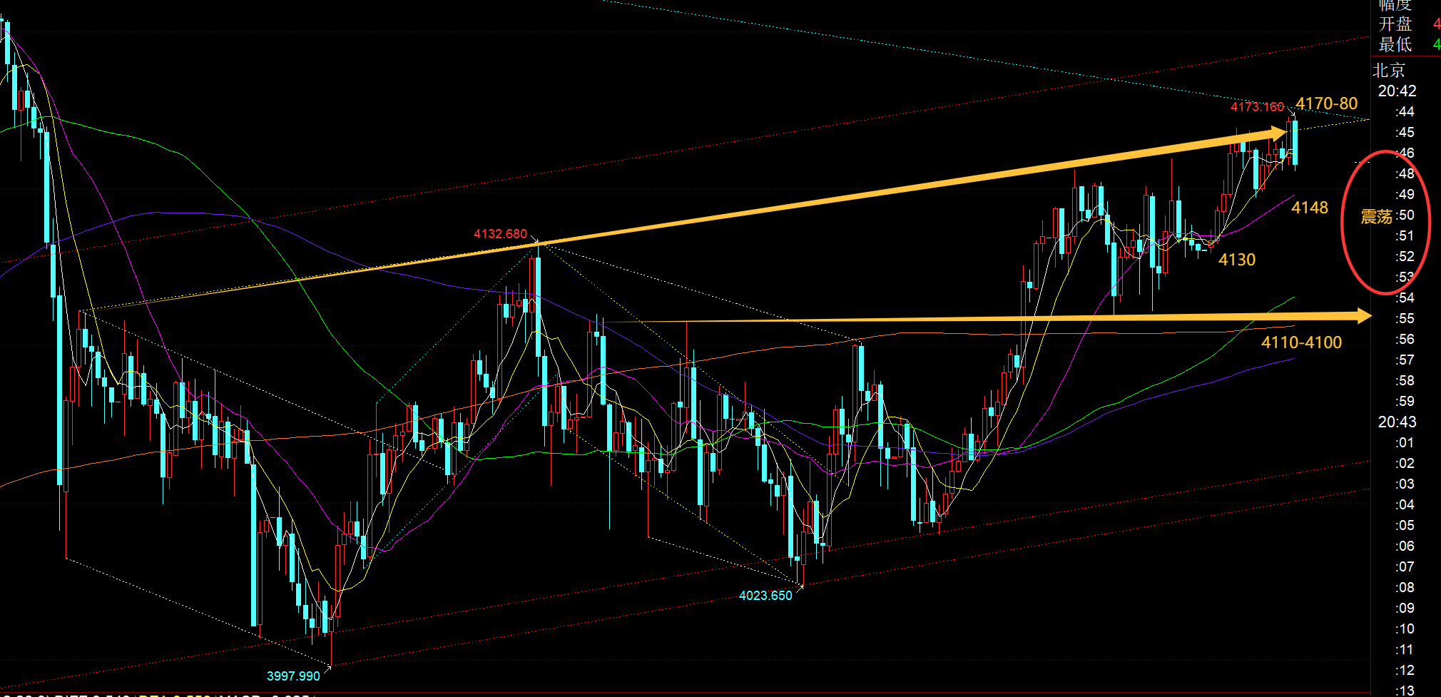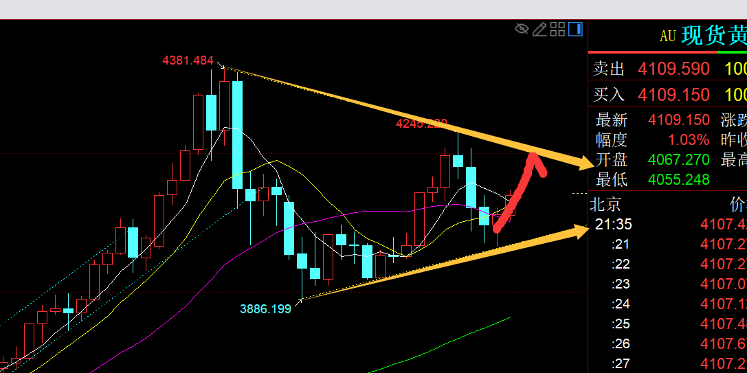 郑氏点银:黄金4192直接越过,次高点延续至下一个4275 回顾昨日行情走势及出现的技术点: 第一,黄金方面:昨日早间冲高回落,大阴失守小时线10日,则代表逼空结束,展开回调震荡修正,则4121跟随一波看跌下行,最低触及4098逢低拿下;由于当时连阴走的形态可