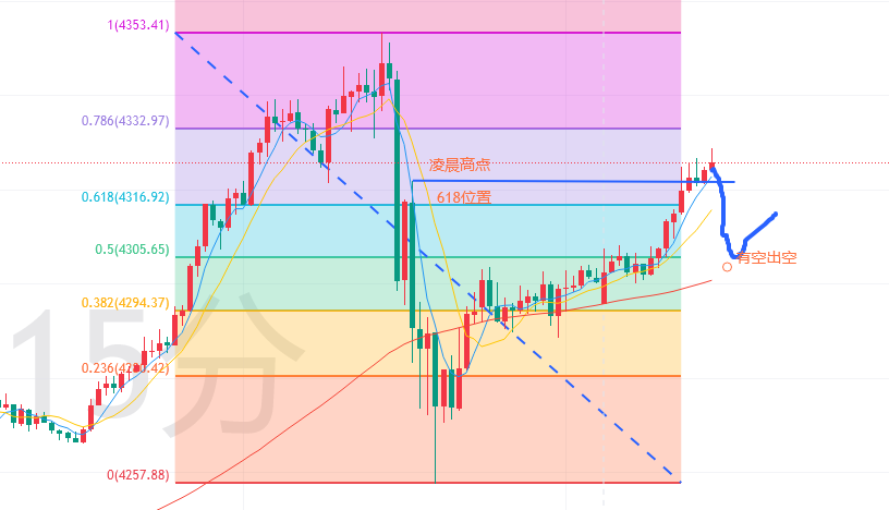 而如果欧盘二次破早间低点4264回撤修正,形成欧盘压制在昨日高点4285下方,那么美盘最多看震荡,欧盘长期横盘,美盘也谨防二次回撤走震荡。