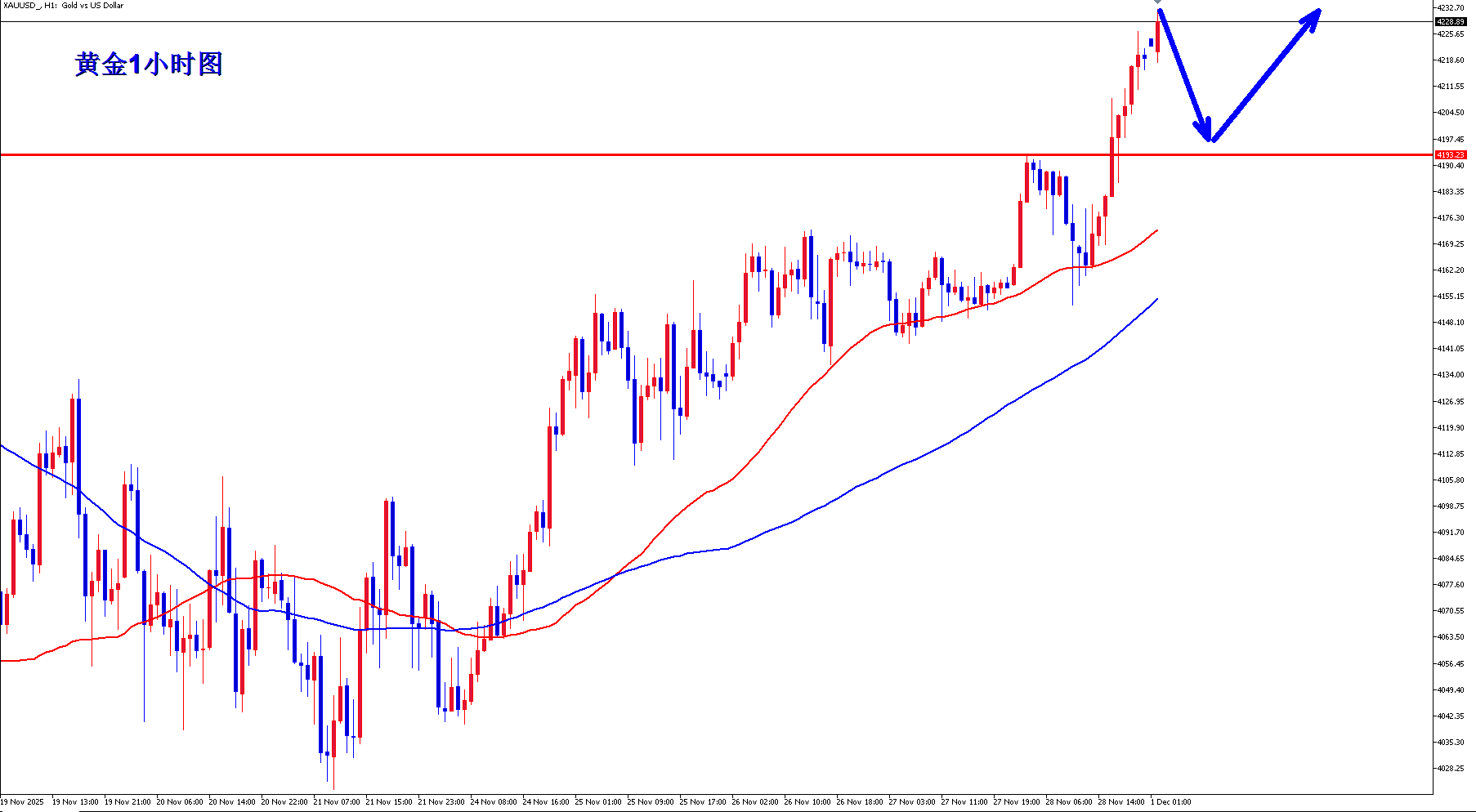 黄金1小时均线其实现在也是不断上下穿梭,这也是典型的震荡行情,不过这种行情也预示着可能即将变盘,黄金1小时现在开始走三角形收敛性形态,三角形下沿支撑现在已经上移到4180附近,上方阻力4223附近,那么黄金在这个小区近范围之内再来回震荡一下,就开始到三角形末端,那么就即将迎来变盘行情,黄金1小时现在整体是上行节奏,那么接下来大概率可能会向上变盘,黄金早盘回踩4180附近继续看反弹多。上方首次触及4223短线可以看回落,如果突破,那么就顺势看涨。