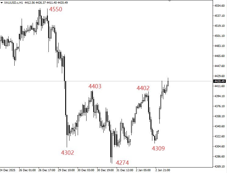 1. 趋势与支撑:黄金从4550高点回撤至4303后,形成双底结构(4302、4309),且二次回撤低点未破前低,属于典型的“回撤企稳”形态;随后反弹突破前期两个高点4404和4402,完成趋势反转的关键突破,多头结构初步确立。